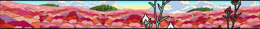 为适配公共空间的观看节奏,我们把“作品”扩展为“场景”。入口处以《最好的早已到来》为名的立体装置像一座时空之门,引导观众完成从日常到艺术的心理切换;40米巨型长屏把巨幕作品变成可被身体感知的光场;而《奇迹般》则以长达26米的壁画尺度,营造出近似美术馆级别的沉浸围合。空间里还被植入“飒蜜和熊”的咖啡店叙事与“送你一朵小红花”的互动区:观众可以在贴纸上写下愿望并贴在墙面,让每一次参与都留下一个小小的可见痕迹。