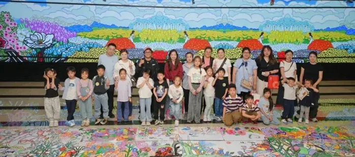 在长卷共创环节,20米长卷《重逢》由亲子家庭共同绘制。孩子们以卜桦作品《奇迹般》《宇宙花园》的美学元素为灵感,以蜡笔、丙烯马克笔等材料进行填色创作,家长协助完成。
