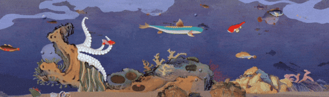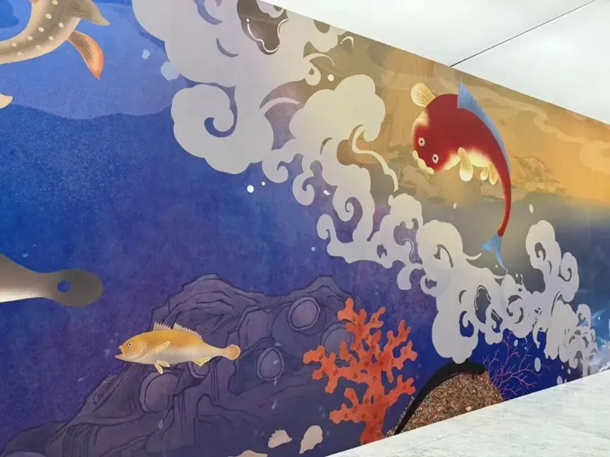 作为展览的重要组成部分,长卷壁画以《海错图》为蓝本,重绘古人笔下的海洋生灵与自然奇观,并以“美好共生”为核心意旨,在传统与现代、真实与幻想之间建立新的平衡;它与数字作品一动一静、相互映照,像是把同一段海洋记忆用两种媒介同时写下。