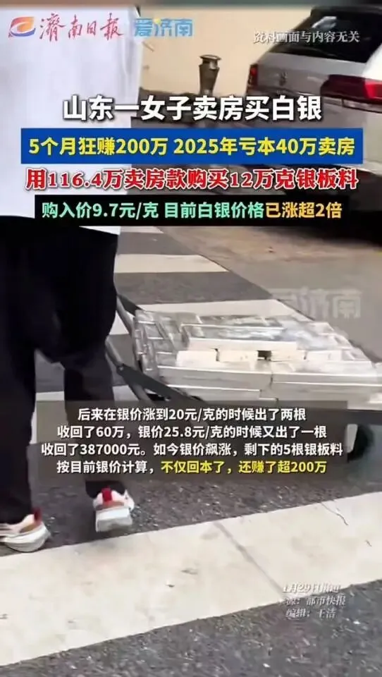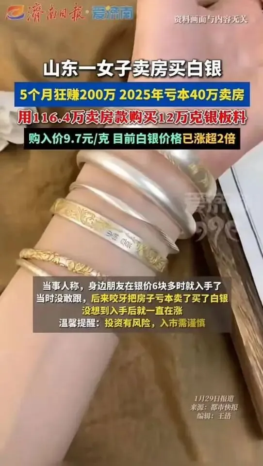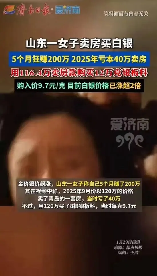 撑死胆大的,饿死胆小的!青岛李女士这波操作,直接让全网炸锅! 手握160万房产,她偏要亏本40万贱卖,拿着120万全款梭哈白银,9.7元/克抄底12万克银料。谁能想到,短短5个月白银飙涨超2倍,她高位套现几波,不仅填平亏损,还净赚200万,笑得合不拢嘴说“赌对了”! 这下评论区彻底分裂,有人羡慕到眼红:这才叫资产腾挪!房子不涨不如换硬通货,我劝朋友别赌,结果被打脸!也有人骂她疯了:这是赌命啊!万一白银暴跌,连住的地方都没了,全家喝西北风? 可千万别被这200万冲昏头!她赚的不是眼光,是踩中了风口的运气,更是拿人生退路换的暴利!地段一般的房子再鸡肋,也是安身立命的底气;白银再香,也是涨跌无常的高风险品,把唯一住房换成银锭,就是抽走了全家的安全垫。 更可怕的是,这种暴富故事正在造孽!让多少人蠢蠢欲动,想卖房、贷款跟风进场,忘了市场从来不同情勇气,只惩罚贪婪。1980年、2011年白银牛市后,多少人从暴富变暴亏,把本金利润全吐回去? 现在连小区保洁都在聊白银要涨50块,恰恰是危险信号!真正的财富智慧,从不是孤注一掷赌风口,而是有余钱可投机,没退路绝不押注。 你有闲钱可以小玩,但若拿着养老钱、买房钱跟风,赢了是故事,输了就是事故!李女士的幸运是特例,普通人的安稳才是常态,别让一夜暴富的幻觉,毁了稳稳的幸福! 你敢卖房炒白银吗?换作是你,会选安稳还是赌一把?素材来源:网络