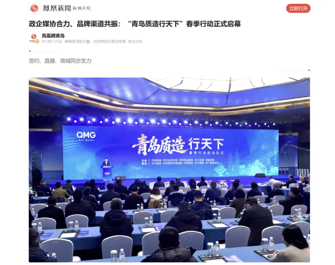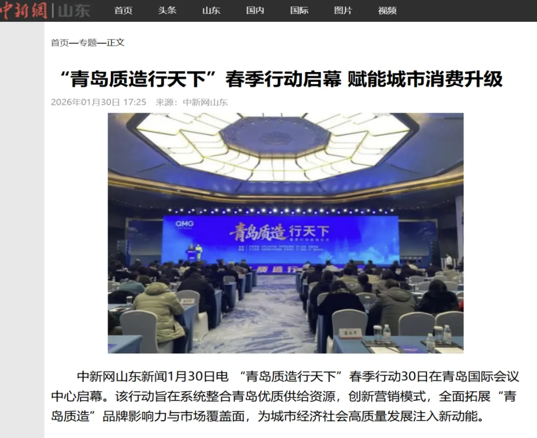 1月30日上午,“青岛质造行天下”春季行动在青岛国际会议中心正式启幕。启动仪式后,活动迅速获得央视新闻、中新网、大众新闻、闪电新闻、凤凰新闻等各级主流媒体广泛报道,形成全国性传播声浪。