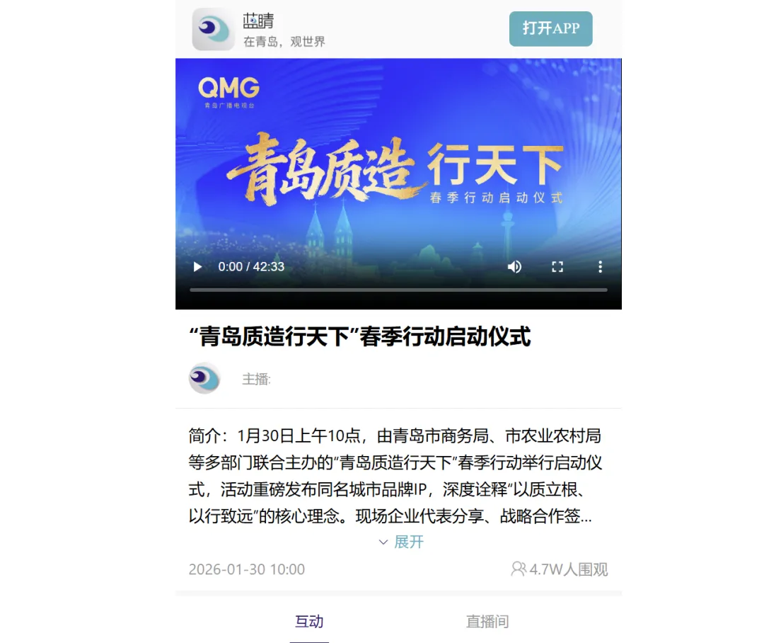 作为主办与核心传播单位,青岛广播电视台全面启动“大屏+小屏”“直播+短视频”一体化传播方案。旗下《青岛新闻》《今日+》《生活在线》《新财经》等栏目进行多角度深入报道;蓝睛客户端、爱青岛客户端进行活动直播;视频号、抖音等移动端平台通过主播探展、短视频等形式,实现精准触达与即时互动。