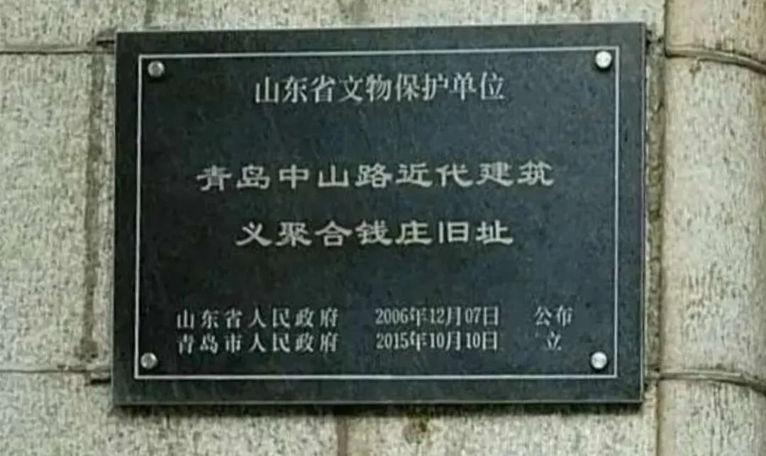 义聚合钱庄:中山路82号义聚合钱庄旧址,1927年,山东掖县夏邱堡乡西庄子村人王德聚与同乡王振六在青岛合伙开设钱庄,号址在保定路5号。经营一年多后,双方遂协商分号,后王振六独资开设了福聚和钱庄,而王德聚则以其本人及二哥王聚义、弟弟王聚合弟兄三人名字的末后一字为名,于1928年2月在原址开设了义聚合钱庄。1934年,义聚合迁入中山路82号中国银行旧址营业并扩展业务。在经营中,义聚合钱庄除办理存款、放款及汇兑业务外,还兼营土产业务,并取得经纪人资格。