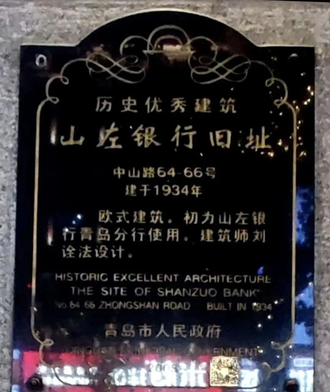 中山路64、66号山左银行旧址:山左银行1922年由青岛绅商傅炳昭等人发起并创立。银行大楼1934年由知名建筑师刘诠法精心设计,于9月22日正式开业。