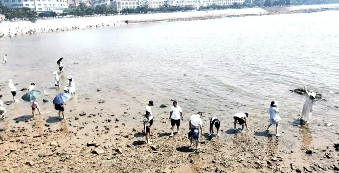 栈桥两边有铁链护栏和莲花路灯,游人漫步于栈桥海滨,可见到远处有军舰驰过,近观有海鸥自由翱翔。涨潮时,惊涛拍打着防波堤,激起簇簇浪花,退潮时,赭色岩礁和金色沙滩露出水面,人们亦可以走下栈桥,漫步在海滩上赶海拾贝。