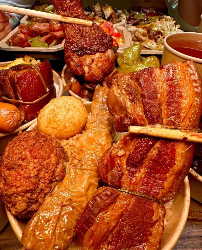 到了饭点,把子肉是绕不开的。这肉看着黑乎乎,其实有讲究。选肥瘦相间的五花,用草绳扎紧了,放在老酱汤里慢火炖。不放盐,全靠酱油提味。炖到时候了,那肥肉不是油,是“胶”,筷子一夹颤巍巍的。咬一口,瘦肉不柴,肥肉即化,那股子酱香在嘴里炸开,配上一碗浇了汤的米饭,给个神仙都不换。