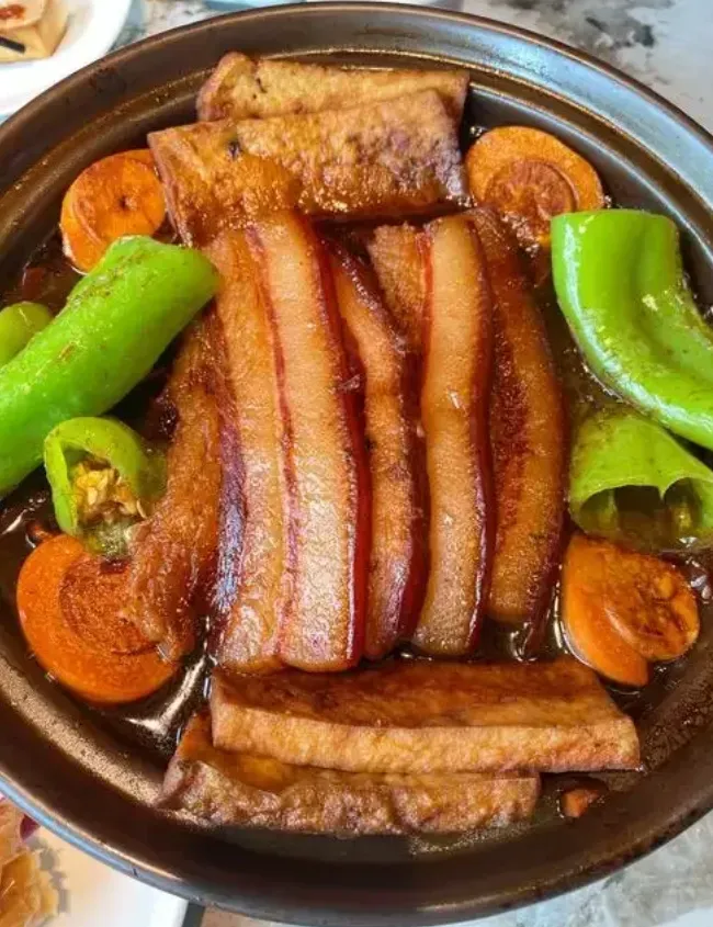 把子肉做法速描:这肉讲究的是“肥而不腻,瘦而不柴”。选带皮的五花肉,切成大长片,用草绳捆扎实了——这是为了煮的时候肉不散。不放盐,全靠酱油提味,放在大锅里慢火炖煮。火候到了,那肉皮变得晶莹剔透,筷子一夹颤巍巍的。咬一口,油脂在嘴里化开,不是油腻,而是一种醇厚的香,拌着米饭吃,绝了。