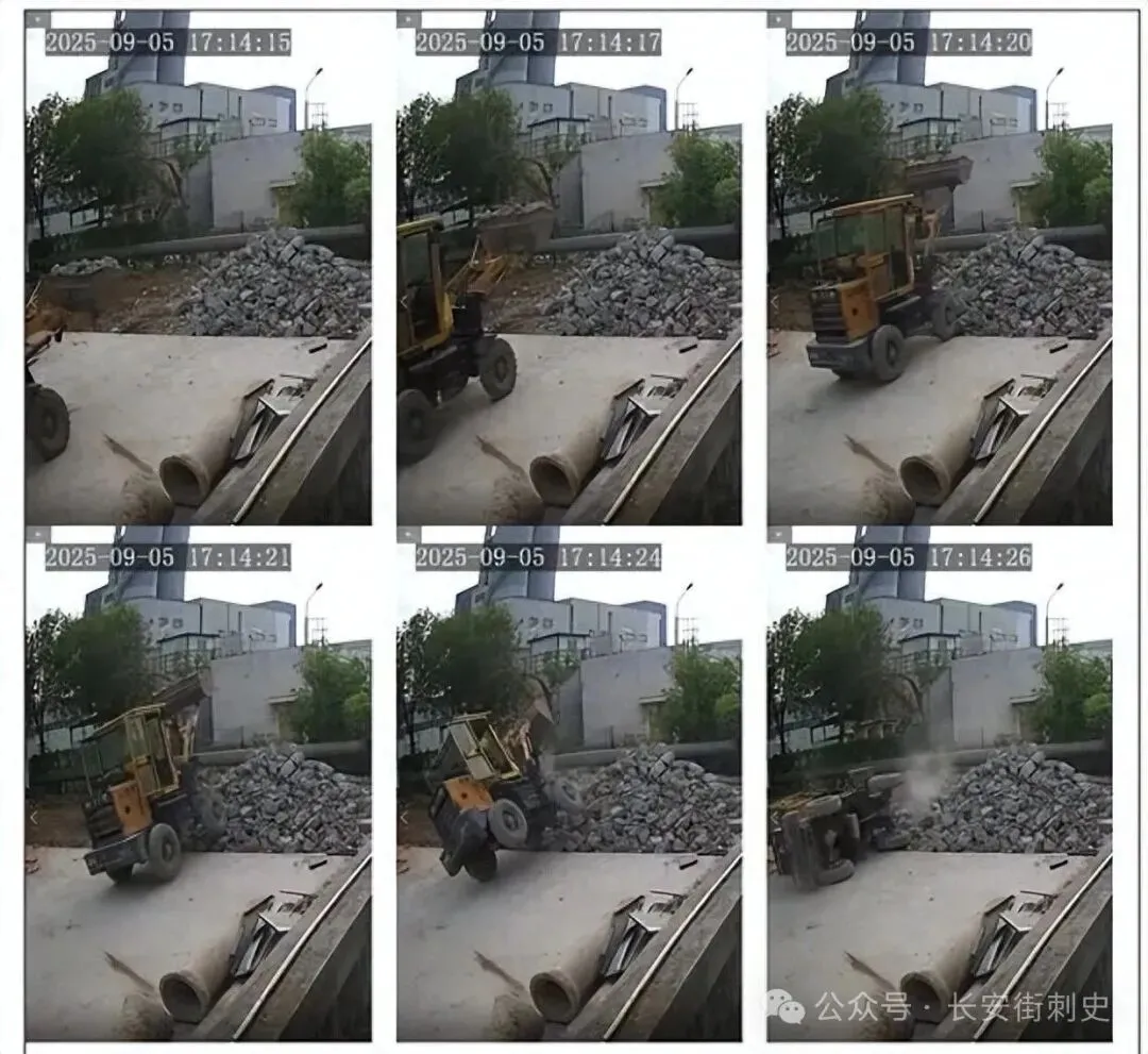 青岛伟隆智慧节能阀门配套技术改造及扩建项目工地内原厂房(4号、5号)与原2号厂房之间的部分道路因施工损坏。9月4日,晟景公司安排两人破碎损坏的混凝土路面。9月5日,二人继续前日未完成的施工。17时14分左右,因现场产生的混凝土碎块过多影响通行,一个工人见装载机操作员不在擅自驾驶装载机,高举装满混凝土块的铲斗行驶至集中存放地附近,边前进边举升铲斗至最高位置,到达集中存放地后未减速继续前进,当右前轮压上混凝土块装载机因重心过高瞬间失去平衡向左完全倾倒。未系安全带的工人在装载机侧翻的过程中摔出驾驶室后被装载机砸中。
