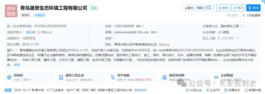 据公开资料显示,青岛晟景生态环境工程有限公司成立于2012年11月1日,法定代表人为曲*良,企业注册地址位于青岛市崂山区中韩街道枯桃社区,所属行业为建筑装饰、装修和其他建筑业。