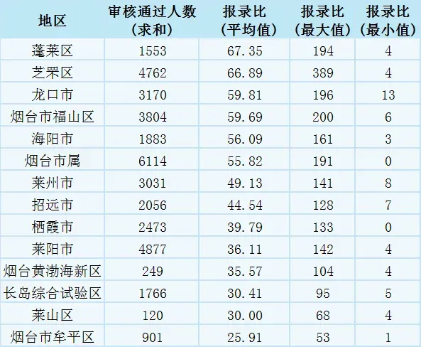 三、烟台各地区报名人数和报录比情况:
