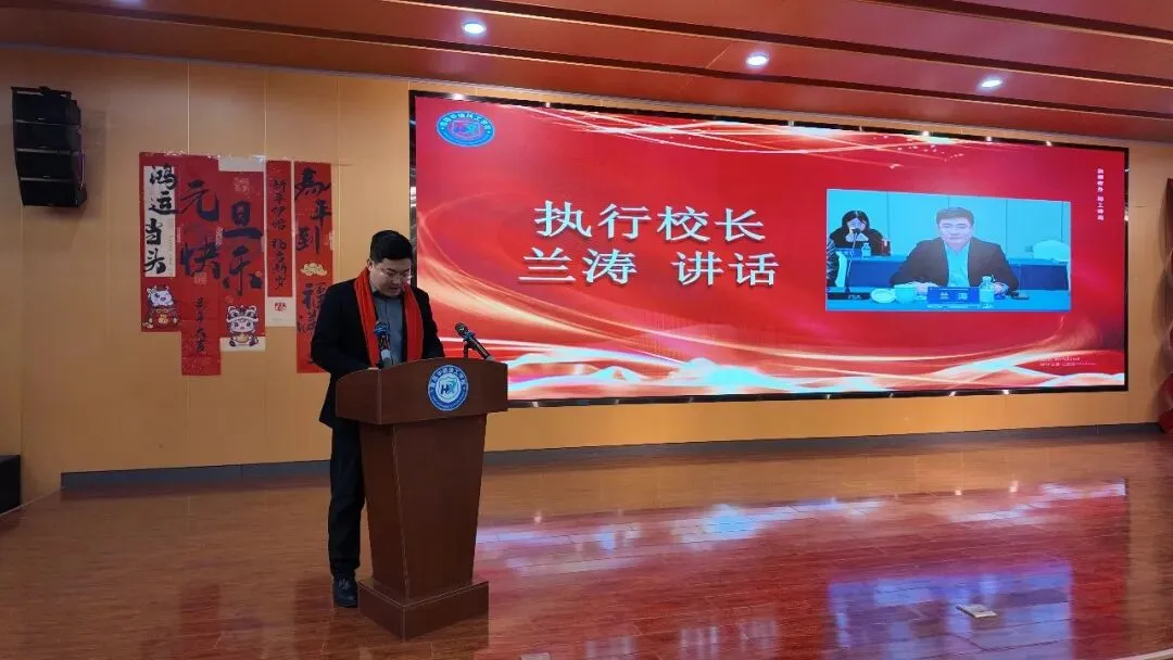 执行校长兰涛作总结讲话。他首先代表学校向受表彰的先进集体和个人表示热烈祝贺,向一年来辛勤付出的全体教职工表示衷心感谢。兰校长指出,2025年是学校发展进程中具有重要意义的一年,全体教职工凝心聚力、锐意进取,各项工作取得了显著成绩