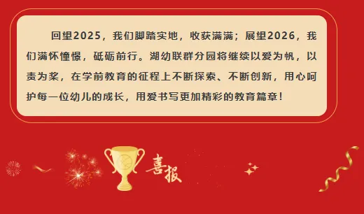 时光匆匆,步履铿锵。2025年的篇章已圆满落幕,这一年,湖幼联群分园始终坚守教育初心,以党建为引领,以幼儿为中心,在温暖守护中深耕细作,在携手同行中收获成长。每一个精彩瞬间都值得铭记,每一份努力付出都闪耀光芒,让我们一同回溯这一年的美好与感动……