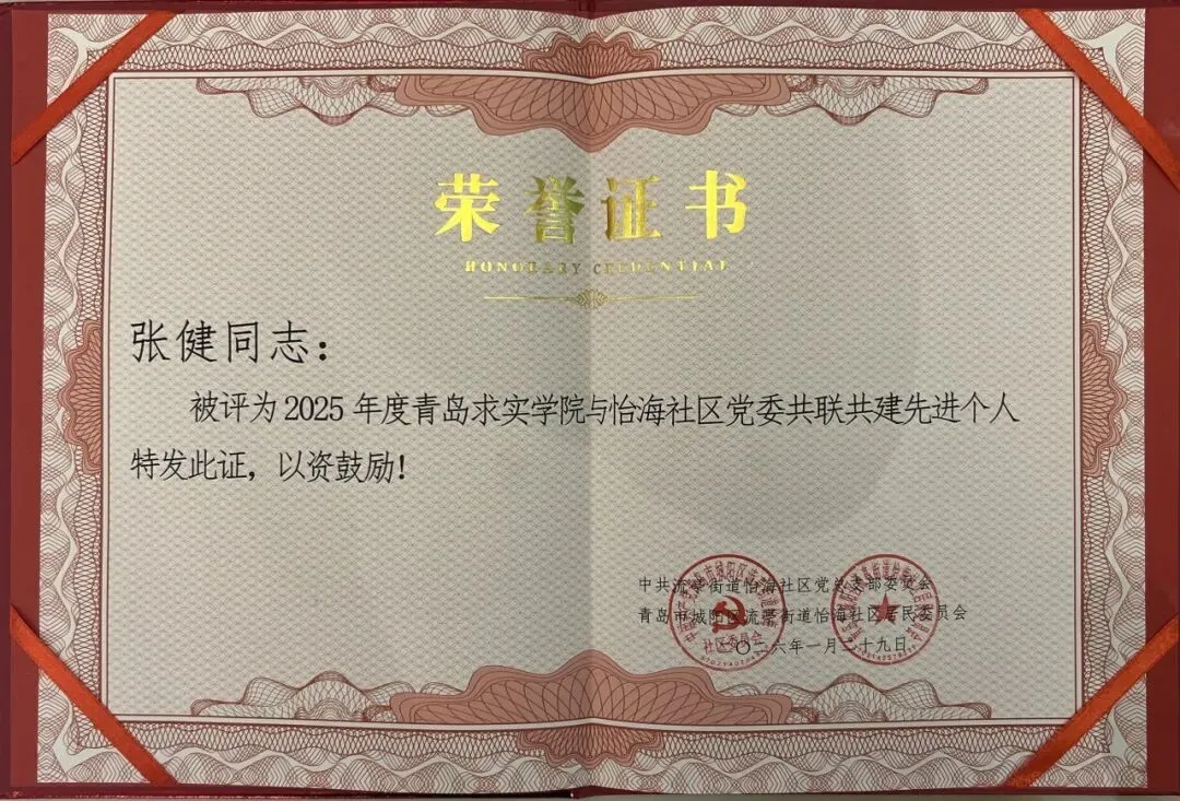 1月29日下午,青岛求实职业技术学院第五党支部应邀参加城阳区流亭街道怡海社区召开的年终总结表彰大会。青岛求实职业技术学院第五党支部被授予“怡海社区优秀联建共建单位”荣誉称号,张健同志荣获“共联共建先进个人”称号。