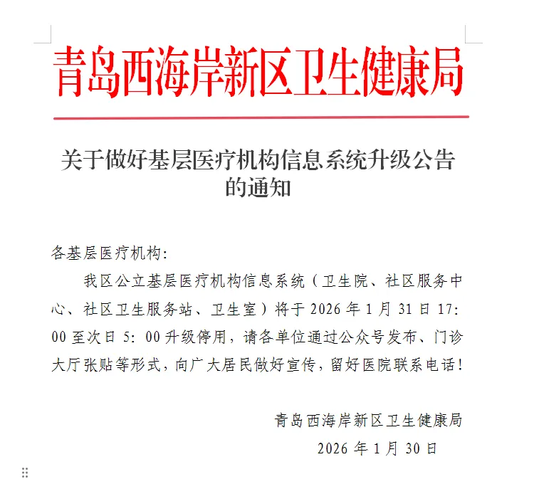 为进一步优化医疗服务流程、全面提升服务效率与患者就医体验,根据全区基层医疗机构信息系统升级统一工作部署,平台定于2026年1月31日(周六)17:00至次日5:00,开展信息升级工作。