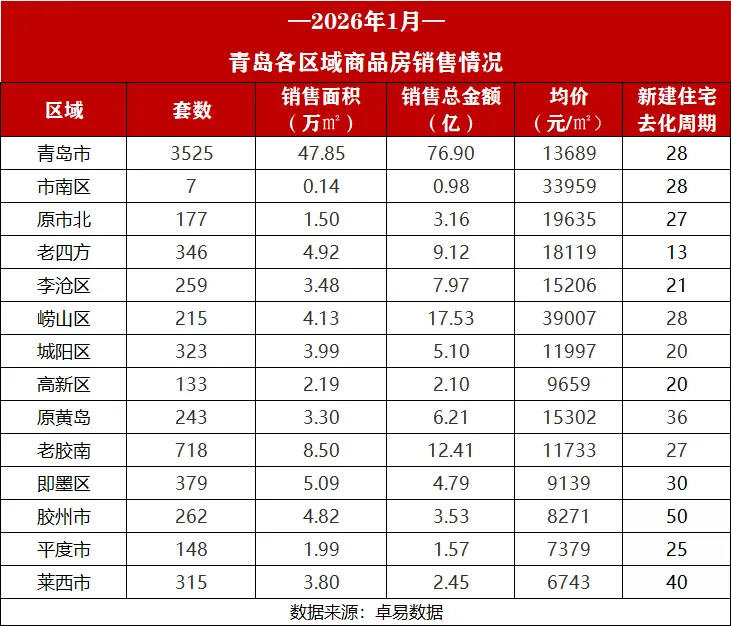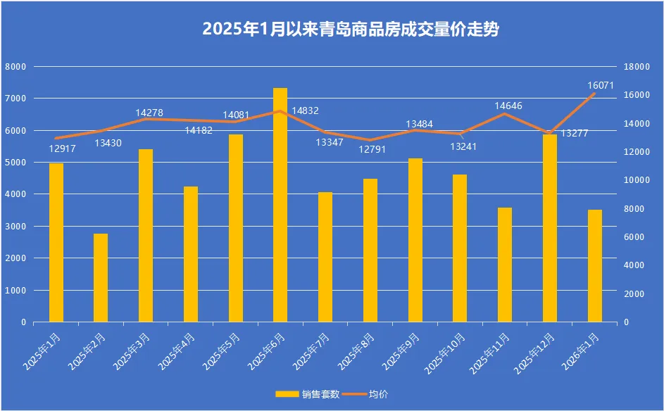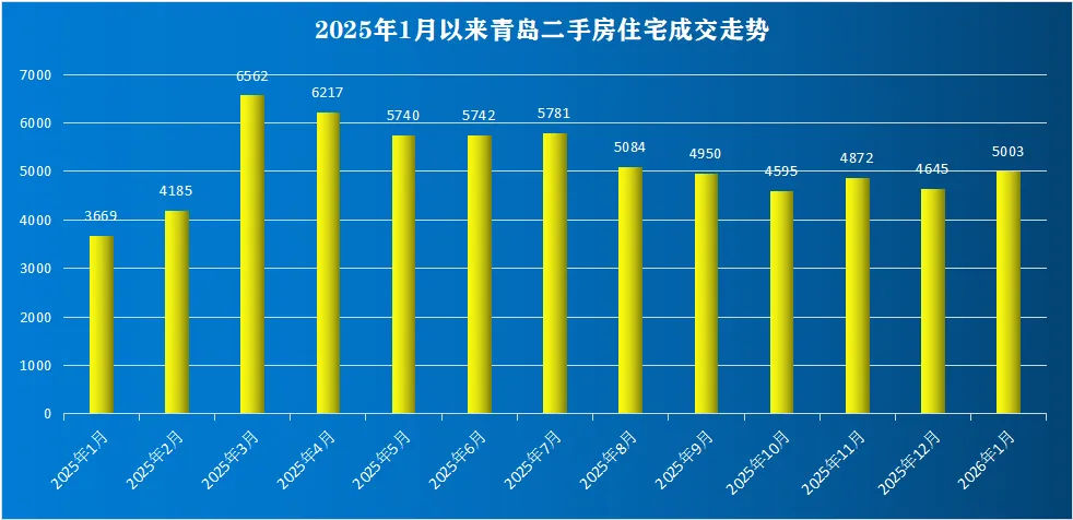 二手房成交套5354套(住宅5003套),二手房交易量明显高于新房,新房刚性需求流向二手房。青岛新房、二手房2026年1月合计成交约8879套。