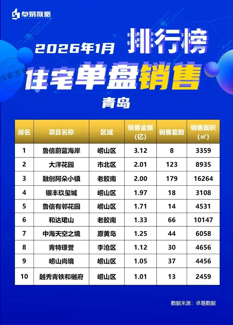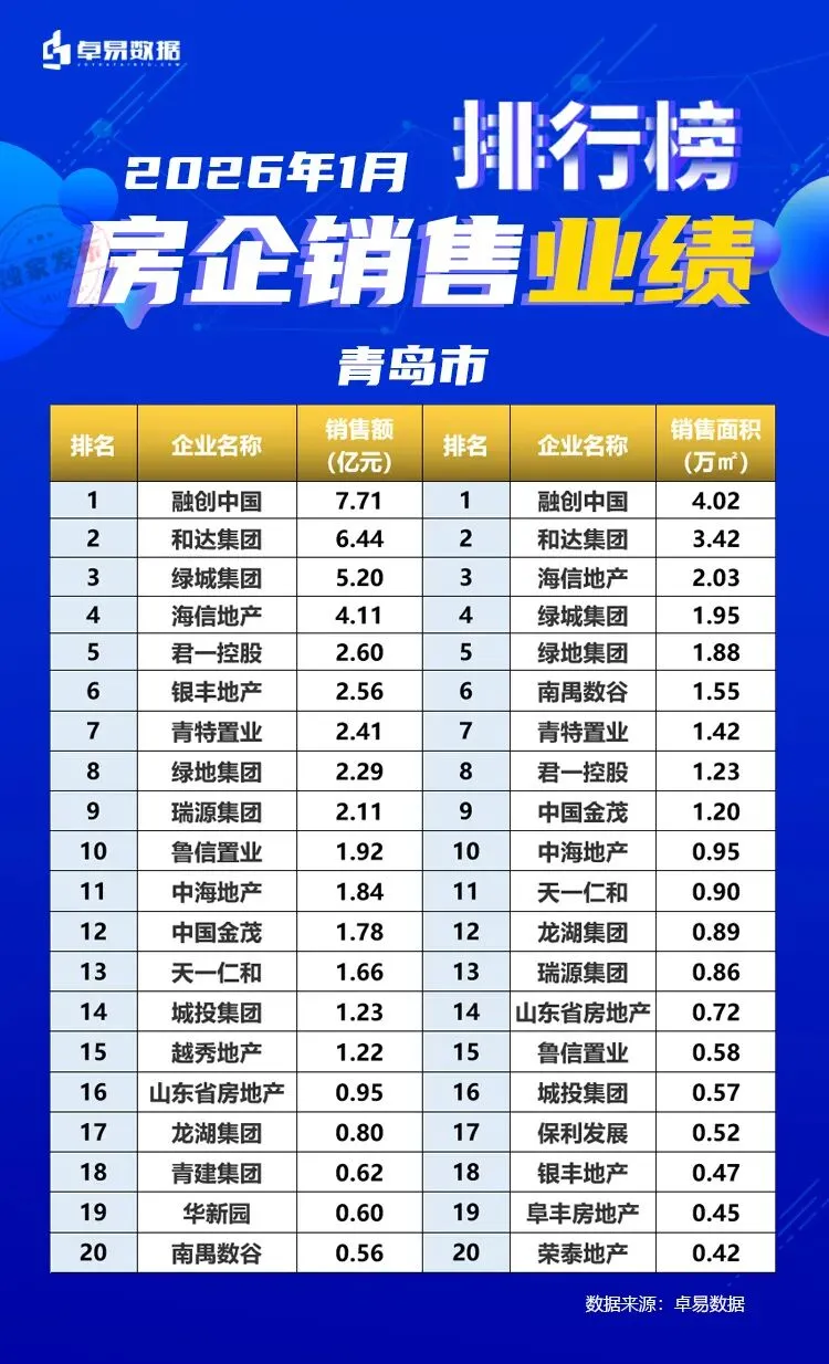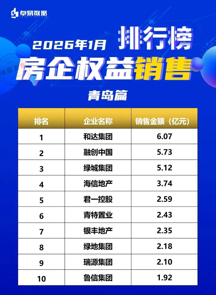 本榜单是根据卓易数据的独立研究,将青岛所有可售项目按照工商注册股权逐一进行权益拆分,剔除重复并表、重复计算的统计方法,展现一个客观的房企商品房销售权益“战绩”,更能清楚一家房企的实际业绩,更好的用于课题研究和监测。