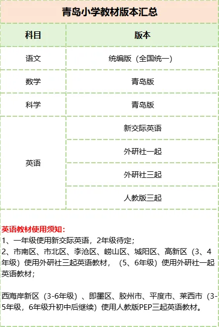 (1)市南区、市北区、李沧区、崂山区、城阳区、西海岸新区,1-2年级使用外研新交际英语;3-4年级使用外研社三起点教材;5-6年级使用外研社一起点教材。