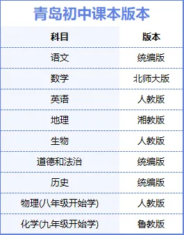 青岛初中阶段,八年级开始学物理,九年级开始学化学。2025级新初一新生关注语文、数学、英语、地理、生物、历史、道德与法治这7科的教材版本。