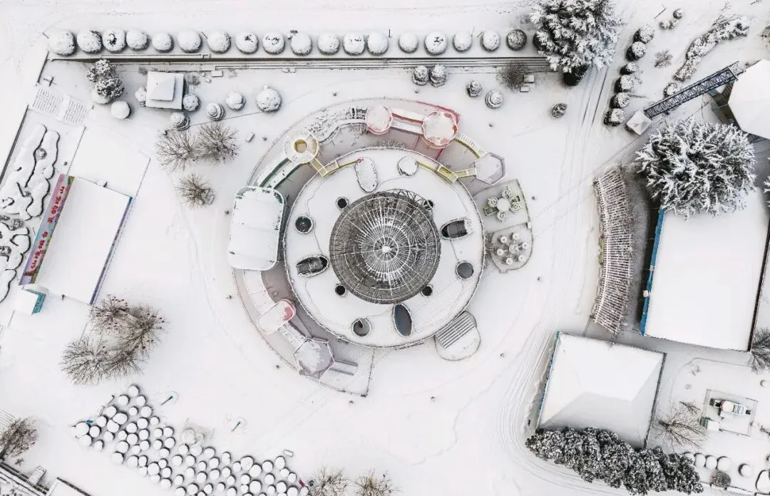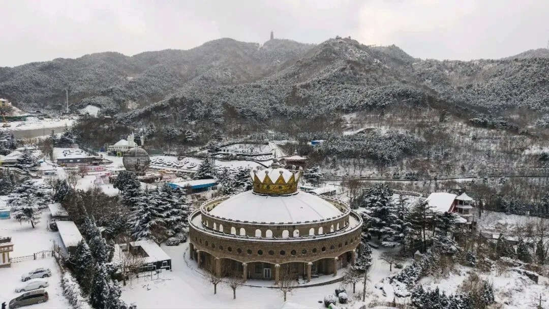 行至芝罘,塔山风景区是途中别样的景致。青山尽被白雪覆裹,漫山皆是茫茫林海,天地间一片素白。远处山巅的三和塔孑然矗立,在皑皑白雪的映衬下,更衬出整座山林的静谧与深邃。景区入口处的圆顶建筑,雪落穹顶,线条别致,亦是取景出片的佳处。
