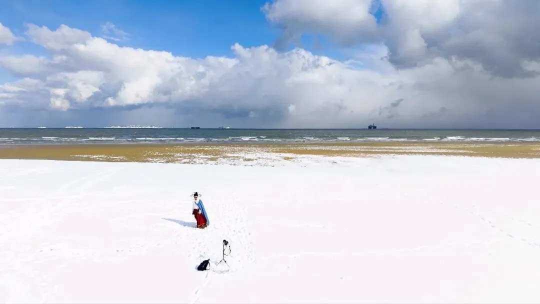 抵达蓬莱时,雪后的蓬莱阁正上演着“人间仙境”的实景。红墙黛瓦被白雪轻覆,海雾氤氲中,楼阁错落有致,宛如水墨长卷徐徐展开 。登阁远眺,海与雪在天际线交融,分不清是雪落海面,还是浪涌云端,此刻才懂为何八仙要在此处踏浪而行。