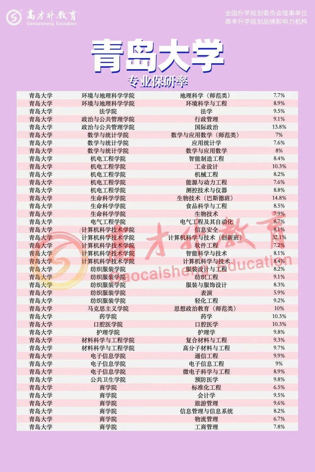 2. 部分商科与应用型专业:如标准化工程(6.5%)、物流管理(6.7%)、表演(5.9%)等。