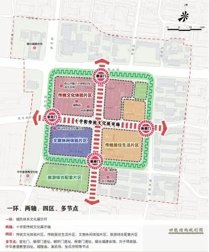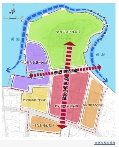 #烟台山——朝阳街历史文化街区 以“山海联动、轴线引领、分区赋能”为核心,形成“一带两轴五区”的功能布局结构。