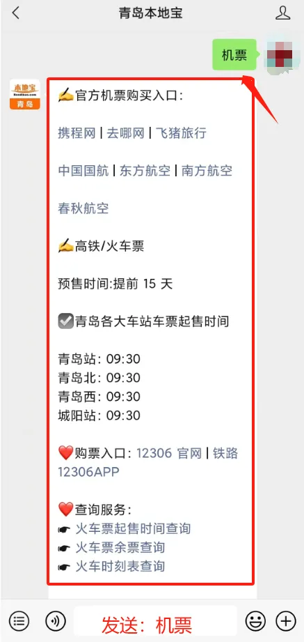 在聊天对话框内发送【机票】