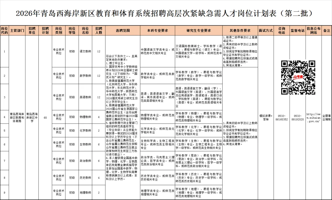 根据《事业单位人事管理条例》(国务院令第652号)、《事业单位公开招聘人员暂行规定》(人事部令第6号)等文件要求以及省、市有关规定,2026年青岛西海岸新区教育和体育系统招聘高层次紧缺急需人才60人(第二批),现将有关事项公告如下: