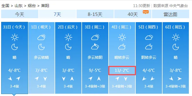 莱阳,未来几天最高气温13℃