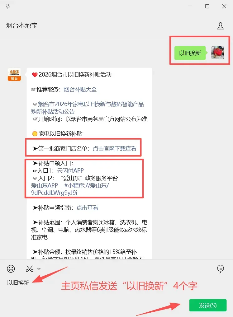 【领取补贴券】→【付款前先主动告知商家参加烟台市消费品以旧换新活动】→【然后再出示付款码】→【单笔支付商品费用享受立减补贴】