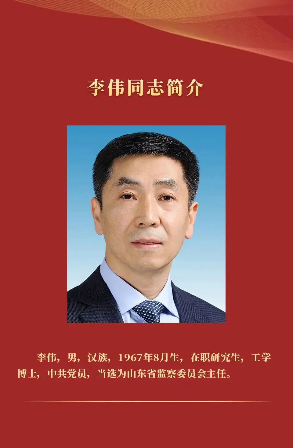 2025年5月—2026年1月,任山东省委常委、省纪委书记,省监察委员会副主任、代理主任,直至此次当选新职。