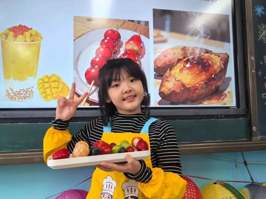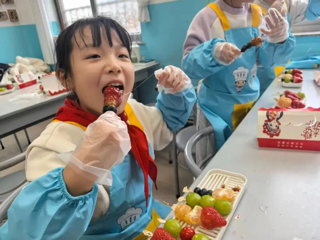 最受期待的环节莫过于制作冰糖葫芦。学生们发挥创意,将山楂、草莓、葡萄等水果穿成串,不仅整齐,更讲究色彩搭配。熬糖是关键,学生们仔细观察糖浆的颜色和状态,把握最佳挂浆时机。当一串串水果裹上晶莹透亮的糖衣,瞬间变成了冬日里最耀眼夺目的“宝石”。