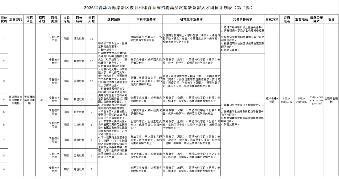 根据《事业单位人事管理条例》(国务院令第652号)、《事业单位公开招聘人员暂行规定》(人事部令第6号)等文件要求以及省、市有关规定,2026年青岛西海岸新区教育和体育系统招聘高层次紧缺急需人才60人(第二批),现将有关事项公告如下: