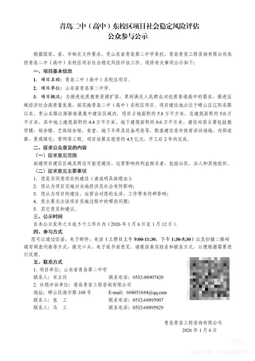 青岛二中(高中)东校区项目社会稳定风险评估公众参与公示,青岛青咨工程咨询有限公司承担青岛二中(高中)东校区项目社会稳定风险评估工作。