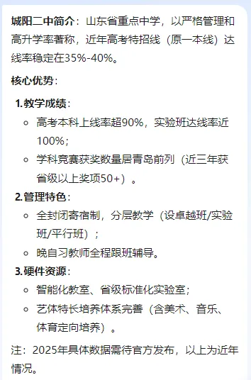 据城阳政务网透露,青岛市城阳第二高级中学(简称:城阳二中)创建于1952年,位于“崂山脚下、白沙河畔”,占地110余亩,具体地址为城阳区夏庄街道办事处夏塔路290号,原名青岛六中,后经区划分别更名为山东省崂山第二中学、山东省城阳第二中学,2002年9月更名为青岛市城阳第二高级中学,系国办全日制重点高中,山东省规范化学校,青岛市现代化学校。城阳二中占地面积73200平方米,建筑面积38811平方米,绿化面积24752平方米。现有64个教学班,在校生3000余人,教职工270余人。学校有教学楼、实验楼、图书管、体育馆、信息楼等多个场馆建筑,各类功能教室齐全,能够满足开展各类课程的要求。据Deepseek智能介绍称: