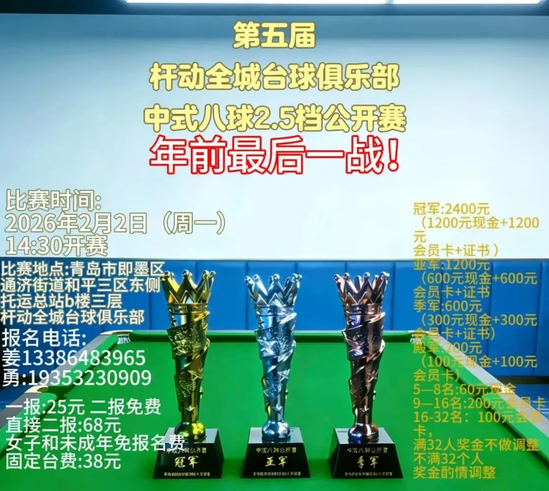 第五届,杆动全城台球俱乐部,限青岛地区2.5档“中式八球大奖赛”年前最后一战,比赛将于2026年2月2日(周一)举办。比赛地点:青岛市,即墨区,通济街道,和平三区东侧托运总站b楼三层,杆动全城台球俱乐部。报名电话:姜13386483965, 勇19353230909(微信同号)。比赛时间:2026年2月2日下午14:00开始点名 14:15抽签 14:30分准时开始。请各位参赛选手提前到达比赛现场,未准时到达比赛现场的选手可以直接二报。一、报名须知:一报25元,二报免费,直接二报68元/人,(女子和未成年免报名费,)比赛期间负方结算台费(固定台费38元),支付方式(现金、微信、支付宝均可)。!!!中途弃赛需缴纳台费!!!二、竞技规则:本次比赛采用小组预选赛N进正赛,固定台费,正赛根据现场情况调整双败或者单败制。三、奖金设置:冠军:2400元(1200元现金+1200元会员卡+证书 )亚军:1200元(600元现金+600元会员卡+证书 季军:600元(300元现金+300元会员卡+证书)请各位参加比赛的选手,提前合理安排充分的比赛时间,超常发挥台球竞技水平,预祝取得好成绩。本次比赛采用最新中式八球竞赛规则,全程可晕袋,赛会严禁故意犯规和小力开球“鸟冲”,开球除母球外,需有至少四颗球碰库,否则视为恶意犯规,当局判负!参赛选手实名制,不允许替赛,随意互换参赛选手,一经发现,取消比赛资格。五:参赛纪律:1、遵守赛会纪律,服从赛会安排,服装得体。2、报名选手须按时参加比赛,比赛开始后,10分钟不到判负一局,20分钟不到判负整场。4、无论任何原因弃赛按无成绩处理,获奖选手须参加领奖,未能参加领奖者,按照弃奖处理。不满32人奖金酌情调整。最终解释权归主办方所有。