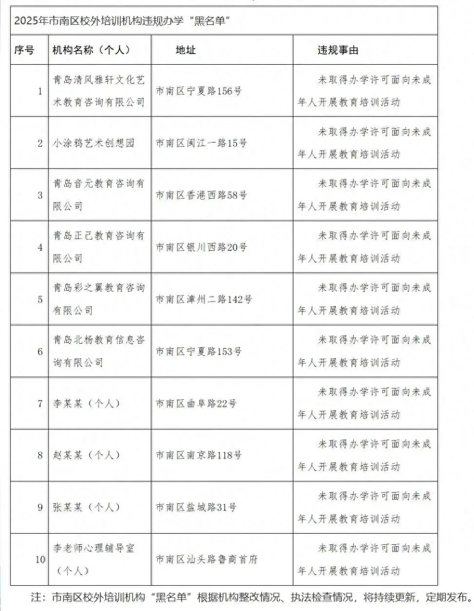 青岛市南区重拳出击,将10家违规校外培训机构列入“黑名单”