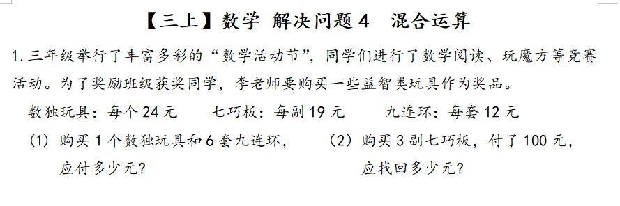 >【三上】数学解决问题4 混合运算(青岛五四新版)