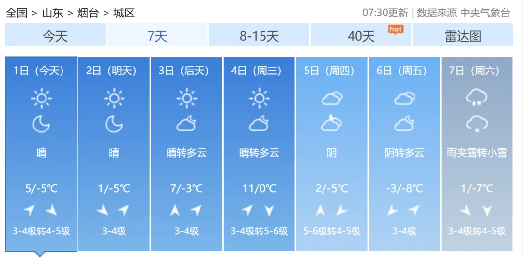 晴转多云;南到西南风,海面5~6级,沿海及内陆3~4级;-7~7℃。