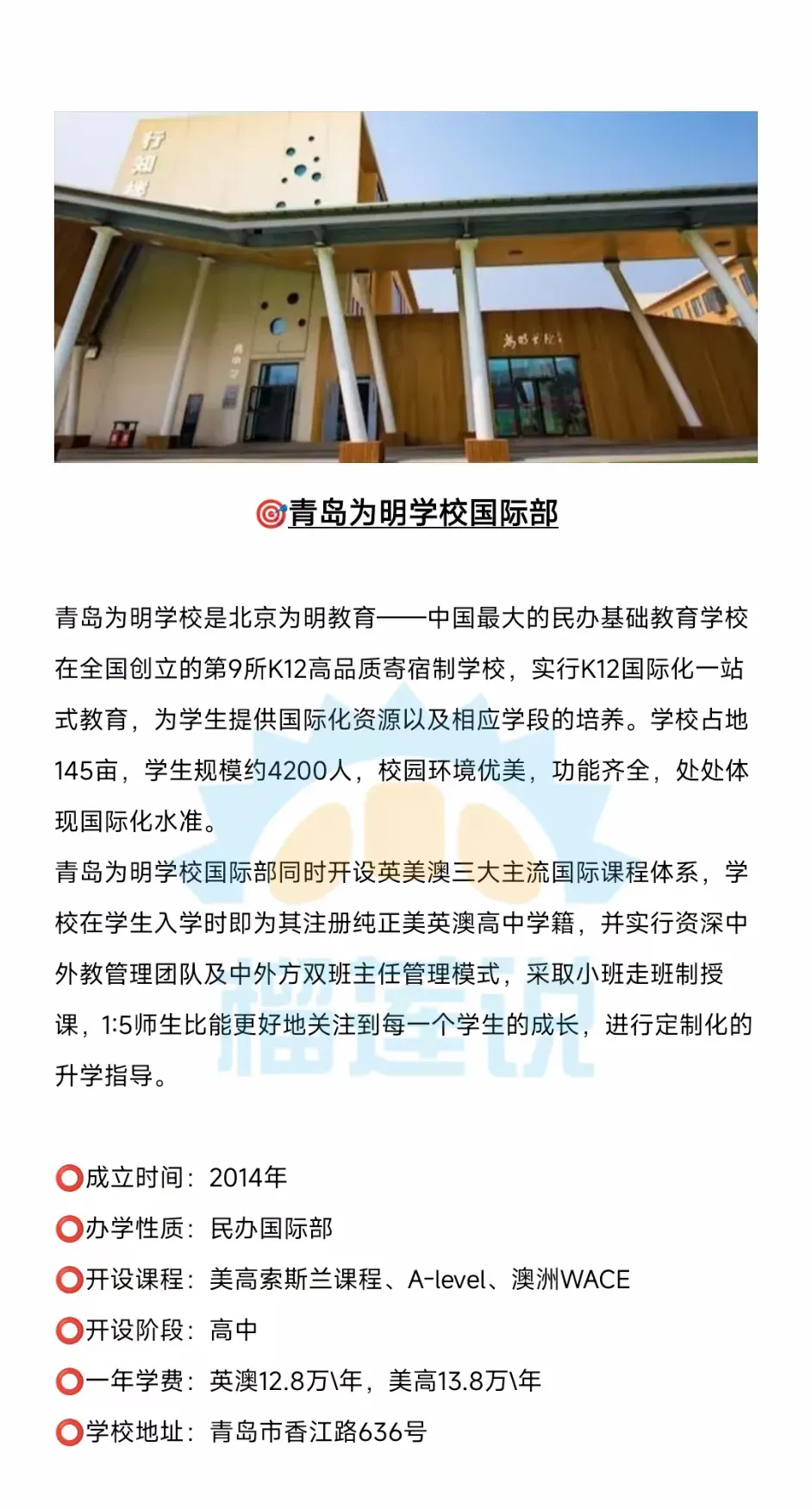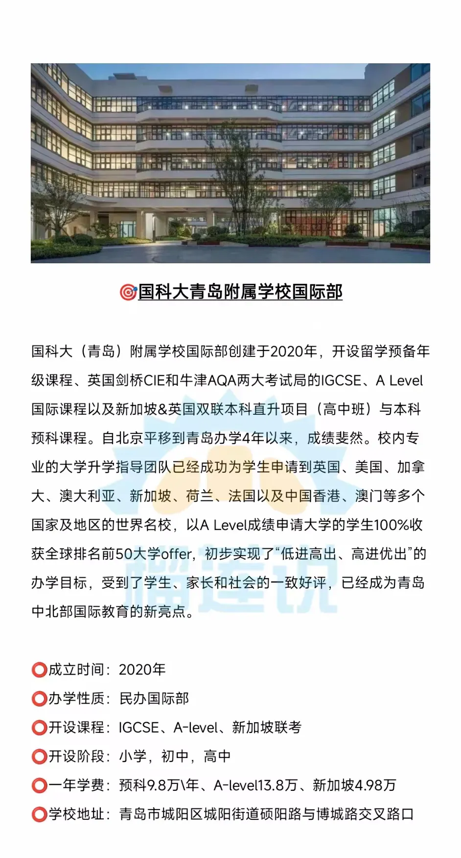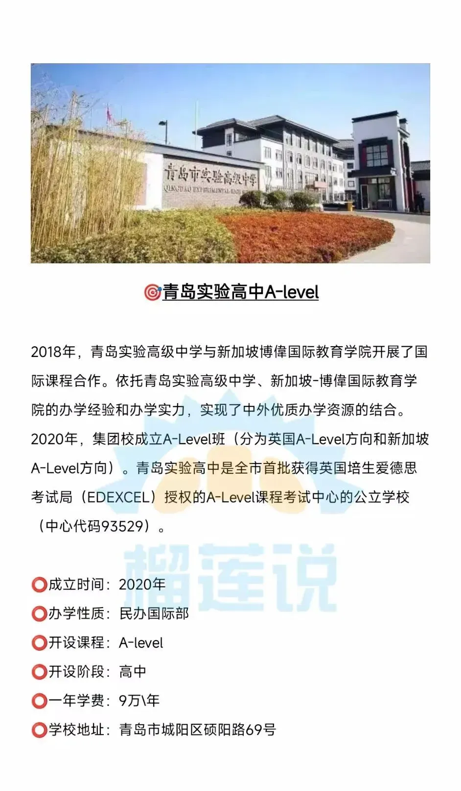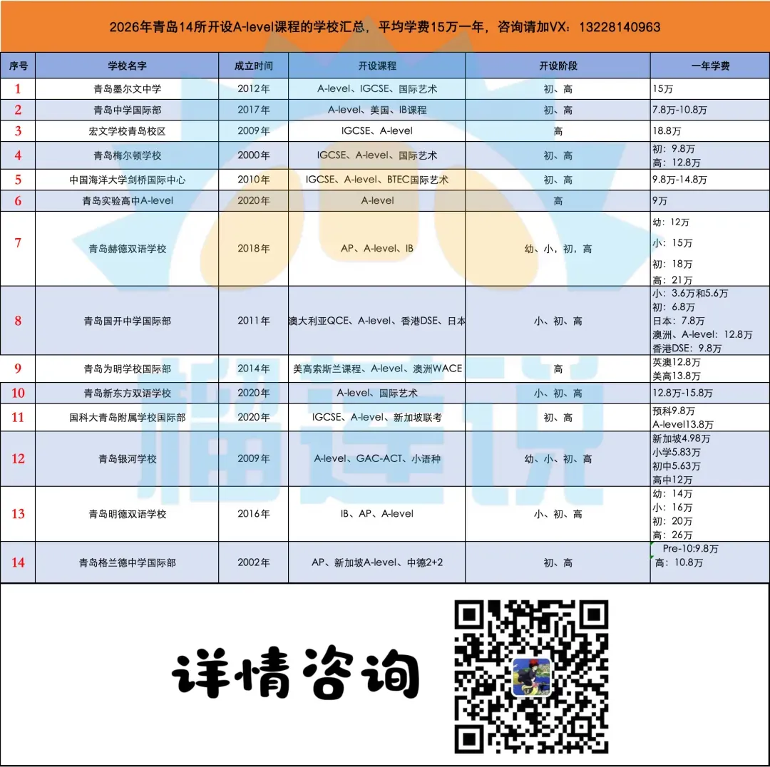 据榴莲说择校平台统计,2026年青岛总共有14所国际高中开设A-level课程,他们是:青岛格兰德中学国际部、青岛实验高中A-level、青岛中学国际部、宏文学校青岛校区、国科大青岛附属学校国际部、青岛银河学校国际高中、青岛梅尔顿学校、青岛新东方双语学校、青岛银河学校国际部、青岛明德双语学校、青岛国开中学国际部、青岛墨尔文中学、中国海洋大学剑桥国际课程中心、青岛为明学校国际部、青岛赫德双语学校。