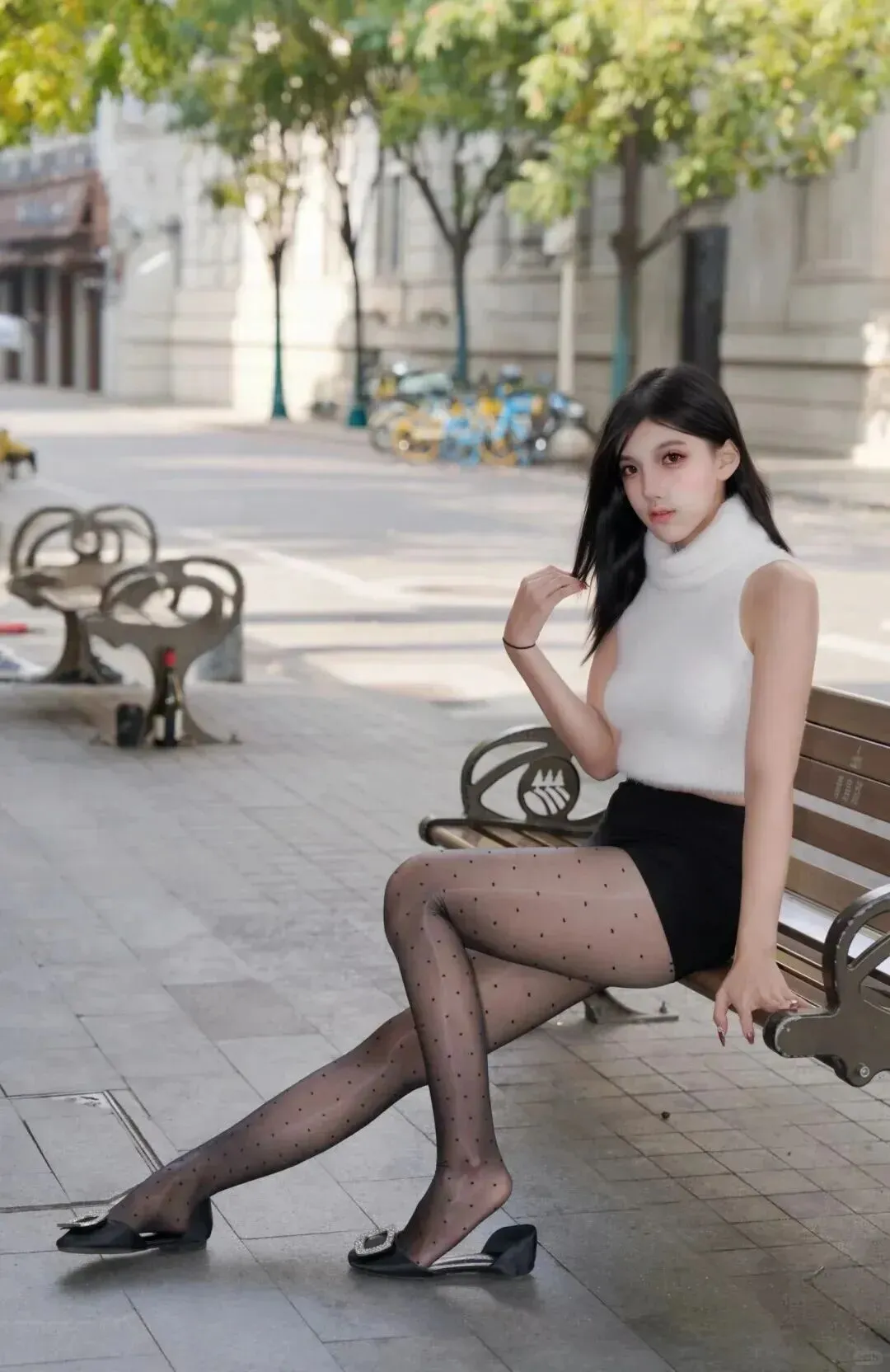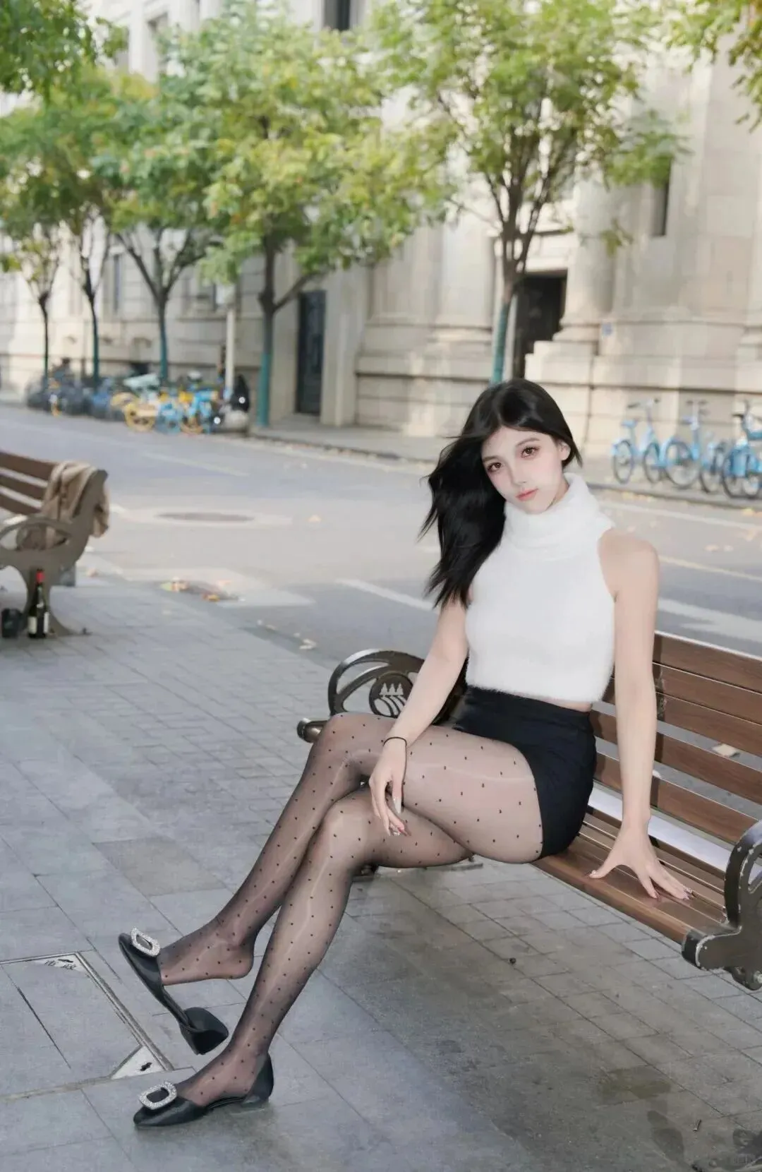 .第一.套真的.太适合夏.天了.。白.色无袖针织.衫配黑色短.裙,脚上穿.双带.波点的.丝袜,.再搭一.双黑色.小低跟。.坐在路边.的长椅上,.随便.一拍.都好看.。记得把.上衣塞进.裙子里,这.样显.得腰细腿.长。这.种穿法.不挑人.,胖一点.瘦一点都能.穿出.感觉。