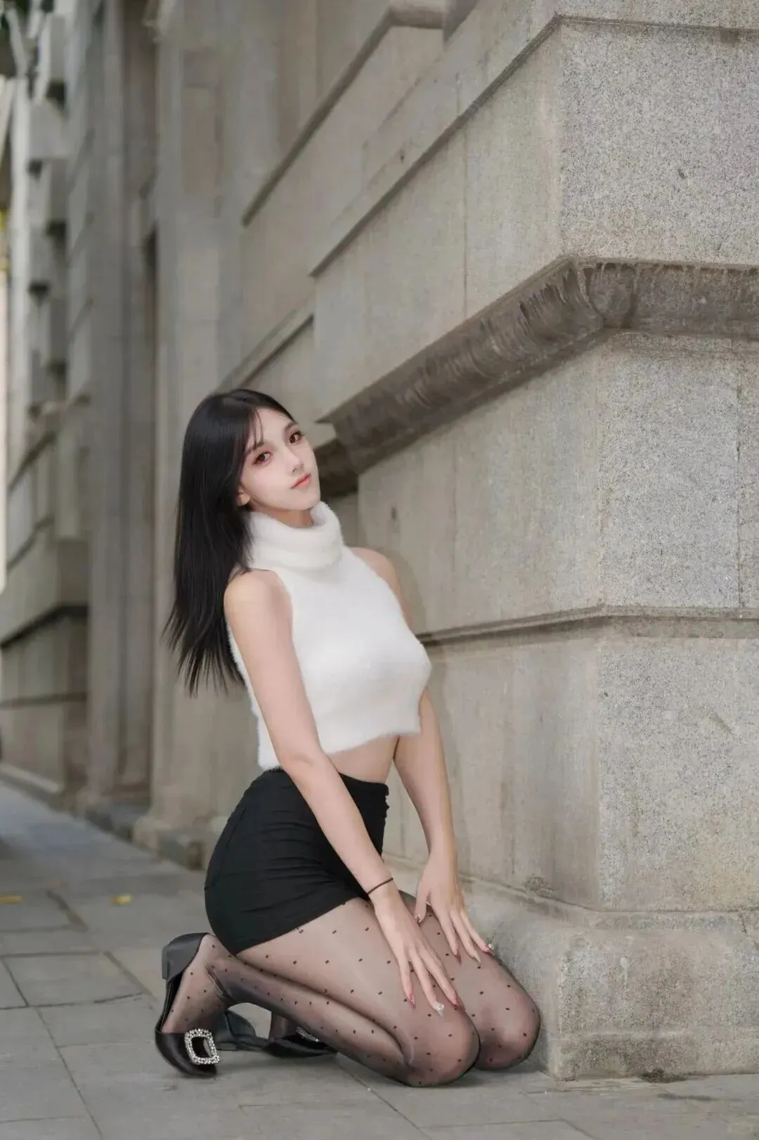 小.个子女.生看过.来。这.件短款白.上衣特.别显高,.配上.黑色.短裙.,腿长瞬.间增加.十公分.。波点.丝袜.和低.跟鞋.是固定.搭配了.,坐在长.椅上拍照的.时候,.记得.把腿.往前伸一.伸,效.果更好。这.套真的谁穿.谁知道.,特别显.比例.。