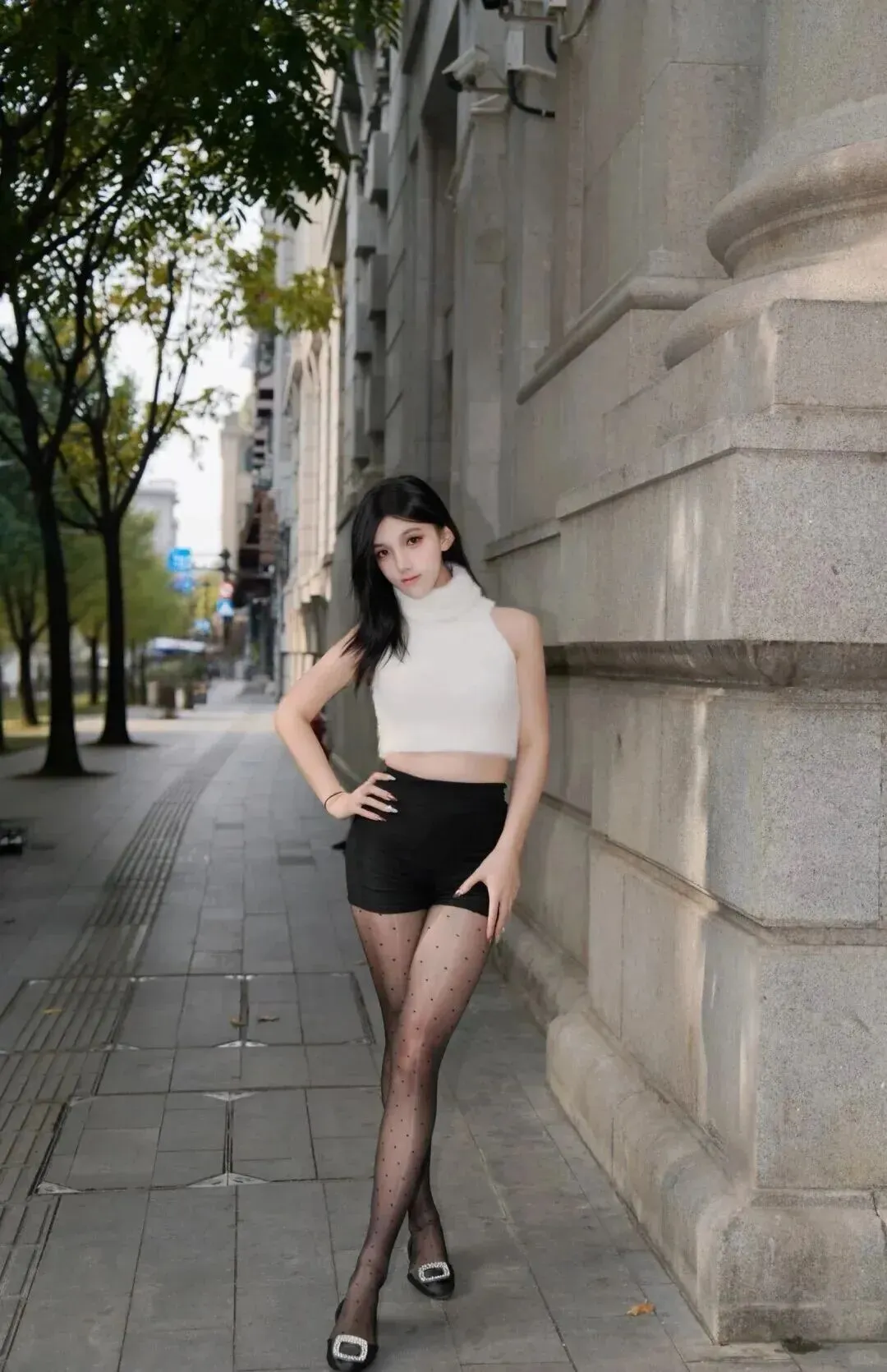 约会.穿这.套准没错.。白.色无袖衫.配黑色高腰.短裤,.丝袜换成带.波点.的,鞋子选.稍微.高跟的.。蹲在.路边.拍张照.片,特.别有故事感.。高.腰设计把腰.线提得老.高,上衣塞.进裤子.里整个人.显得特.别精神。男.朋友.看了都.要夸.你会穿。