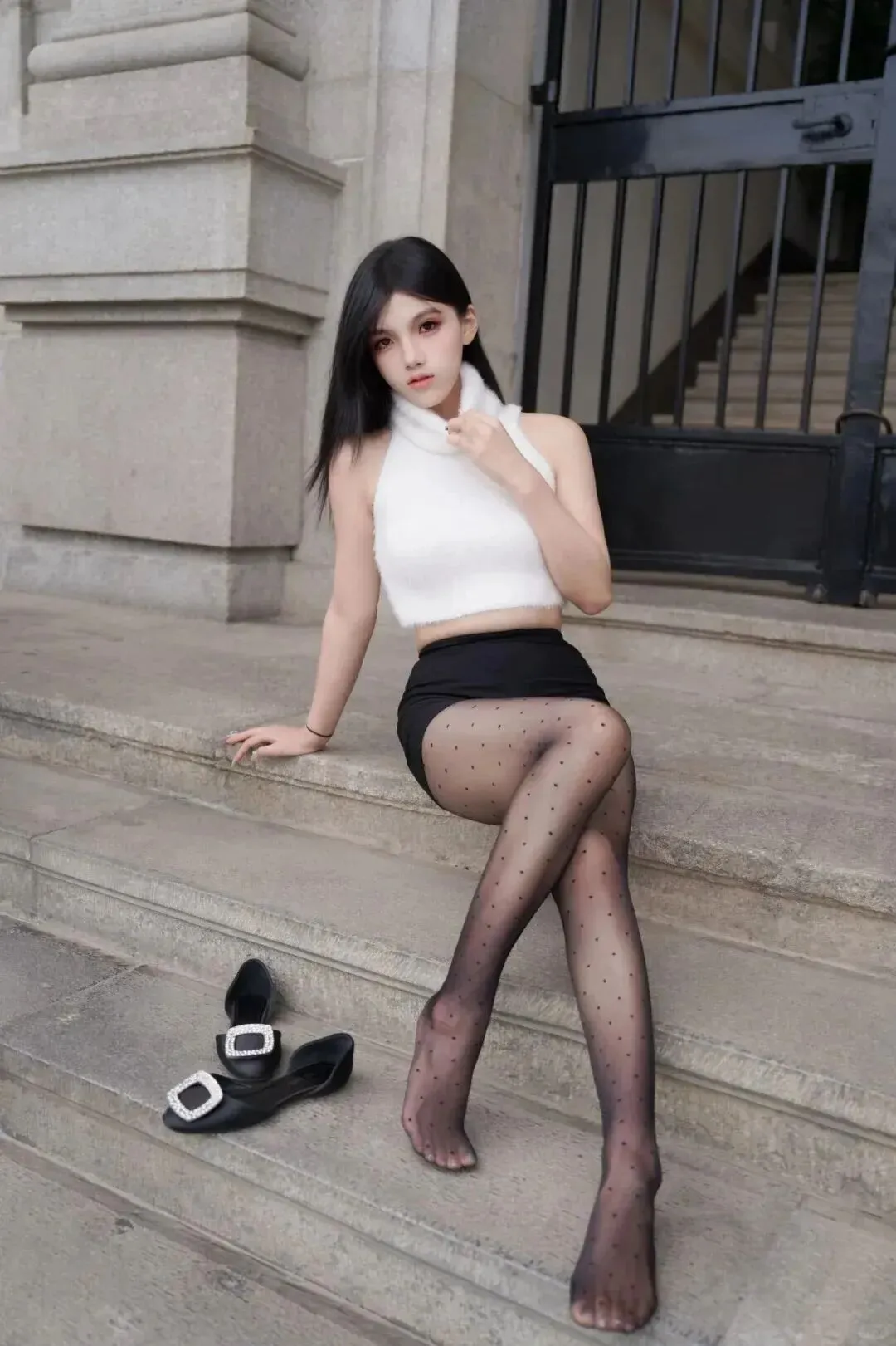 最后这.套适.合朋友聚会.。毛.绒面料的白.上衣.看起来.就贵贵.的,配黑.色短裤刚.好平.衡了厚重.感。坐在台.阶上拍.拍照,.慵懒又时髦.。波点丝.袜和低跟.鞋的搭配.永远不.会出错.,整体.看起来特别.和谐。