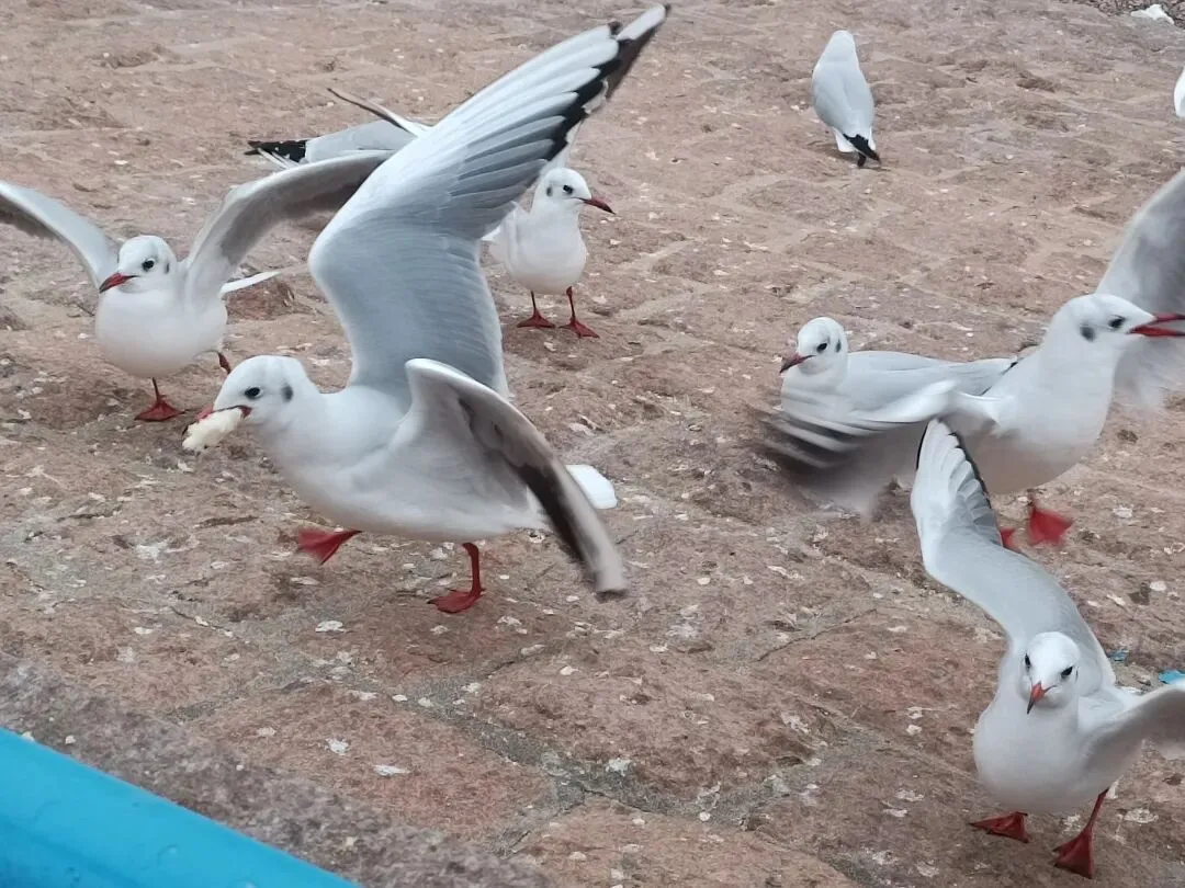 若夫晨光初透,薄雾氤氲,鸥影如云出岫。白羽裁霞,轻似雪花坠海;朱喙衔日,疾如闪电裂空。或振翅高翔,逐天风而舞;或俯冲低掠,啄碧波而鸣。忽而群起盘旋,若素练回风;倏尔独栖礁石,似玉雕静立。孩童掷食,鸥鸟倏忽衔去,翅尖掠指,气流微颤,欢笑语与清啼相和,天人共乐,妙趣横生。