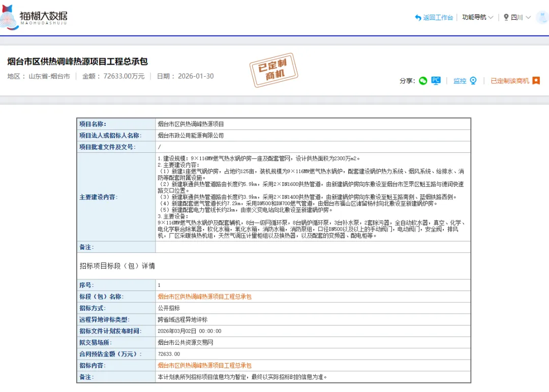 2026年1月30日,烟台市公共资源交易网发布烟台市区供热调峰热源项目工程总承包招标计划。该项目达7.2633亿元,涵盖燃气锅炉房建设、供热管网铺设及配套设施安装,是烟台市能源基础设施升级的核心工程,为建筑行业企业提供全产业链商业机会。