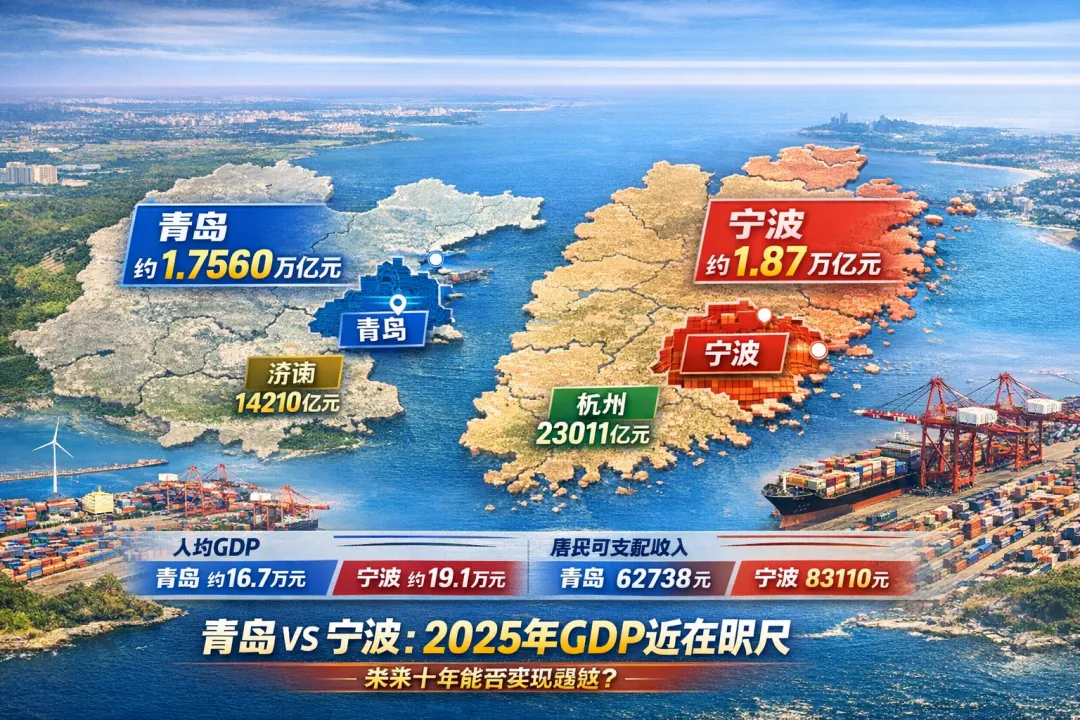 青岛与宁波这对沿海经济老对手,2025年GDP总量竟然出现了一个耐人寻味的瞬间:青岛约1.7560万亿元,宁波约1.87万亿元,双方几乎处在同一量级。先看两个省会城市:2025年济南GDP为14210亿元。2025年杭州为23011亿元过去十年,青岛的经济一直保持稳定增长。2015年青岛全年GDP约1.12万亿元,而宁波同期约1.21万亿元。那时候,青岛还略逊宁波一筹,尤其在人均GDP与居民消费层面。十年过去,差距在缩小,但宁波凭借港口物流与民营经济的稳固优势,仍然保持微弱领先。有人会问:青岛到底是“真强”还是“虚胖”?两座城市的GDP都在万亿级别,看似站在同一高度,但真的是这样吗?按照2024年末常住人口数据推算,2025年两市的人均GDP为:宁波的人均GDP比青岛高出了约2.4万元,而这是基于前一年的常住人口数据推算。实际上,青岛人口增量持续攀升,如果按2025年末人口数据计算,人均GDP差距可能会更小。2025年宁波居民可支配收入城市部分约83110元,青岛约62738元2025年一般公共预算收入:宁波约1790亿元,青岛约1620亿元同时,社会消费品零售总额上,宁波也领先青岛一头,这意味着居民消费能力、市场活力在短期内仍体现出宁波的稳健优势。外贸与港口经济