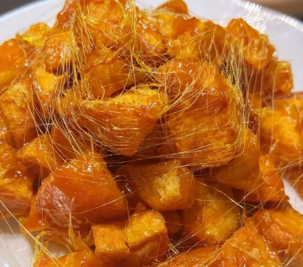推荐尝尝“拔丝苹果”:这菜考验火候。苹果去皮切块,裹上蛋液淀粉糊,下油锅炸到金黄浮起。最难的是熬糖,油糖比例要对,火小了拔不出丝,火大了发苦。趁热上桌,筷子一夹,金丝能拉出半米长,过一下凉水,糖衣瞬间脆裂,咬开是滚烫酸甜的果肉,口感极妙。