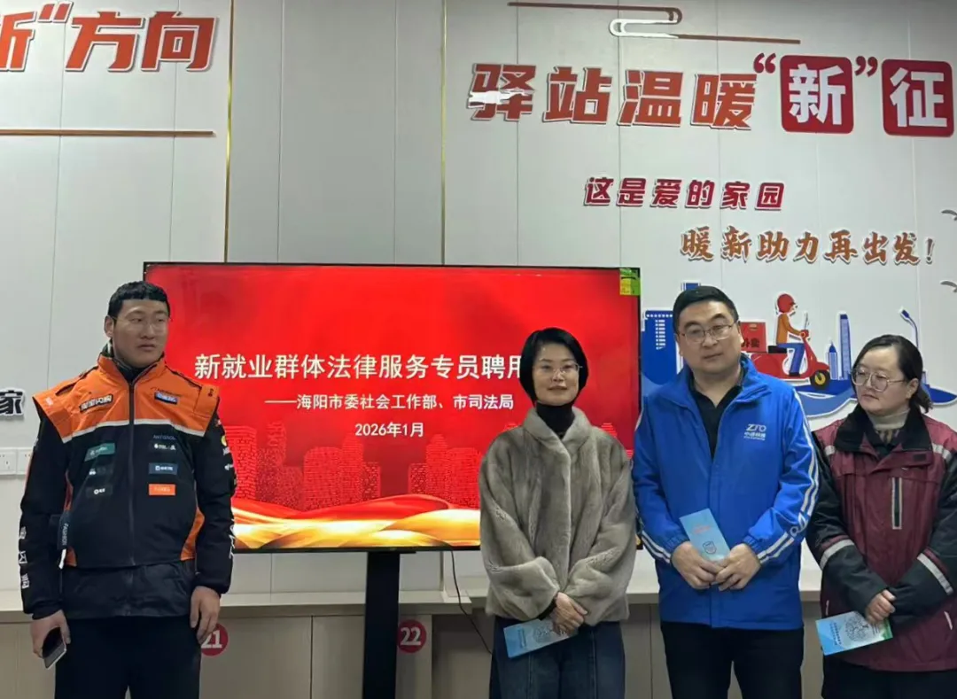 1月26日,海阳市司法局联合多部门,在“烟小暖”暖新驿站开展党建暖“新”腊八主题活动。活动现场聘任了新就业群体法律服务专员,并面向新就业群体详细介绍了法律援助范围、申请流程及维权渠道等,发放了指南手册,以法治力量保障新就业群体权益。