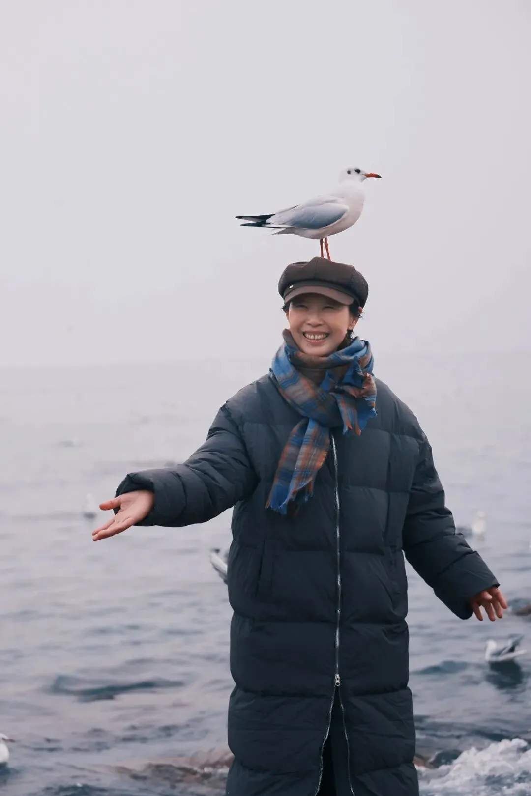 我们举着面包、伸着手,忙不迭地拍照。海鸥一点儿不怕生,敢从手里直接啄食,敢在空中精准接住抛出的食物。甚至有一只,忽然轻轻落在我头顶。